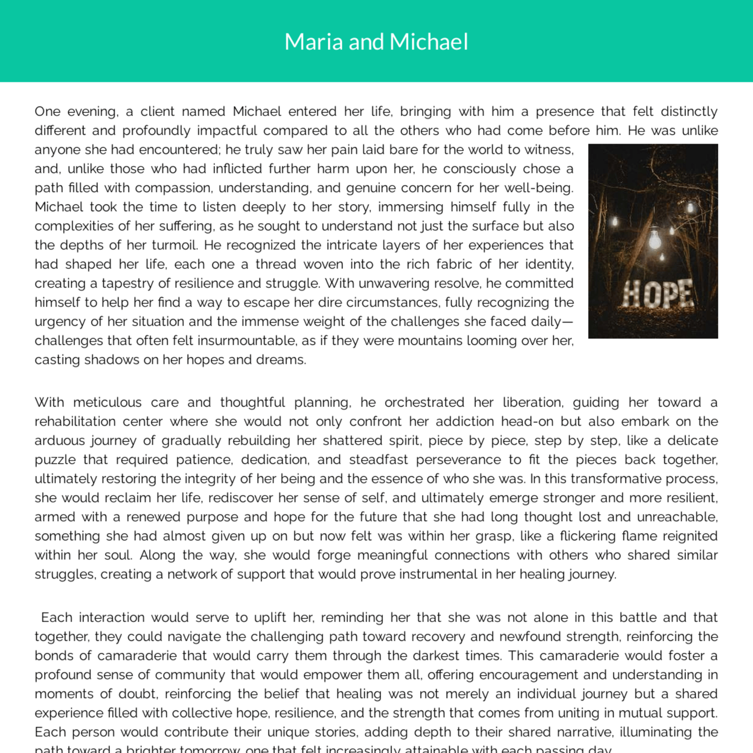 This is the story of Maria and the suffering and difficulties she faced in her life full of challenges and obstacles, until Michael came at very difficult times, as she cooperated with him hard and insisting to confront these harsh challenges that any person may be exposed to in similar circumstances.