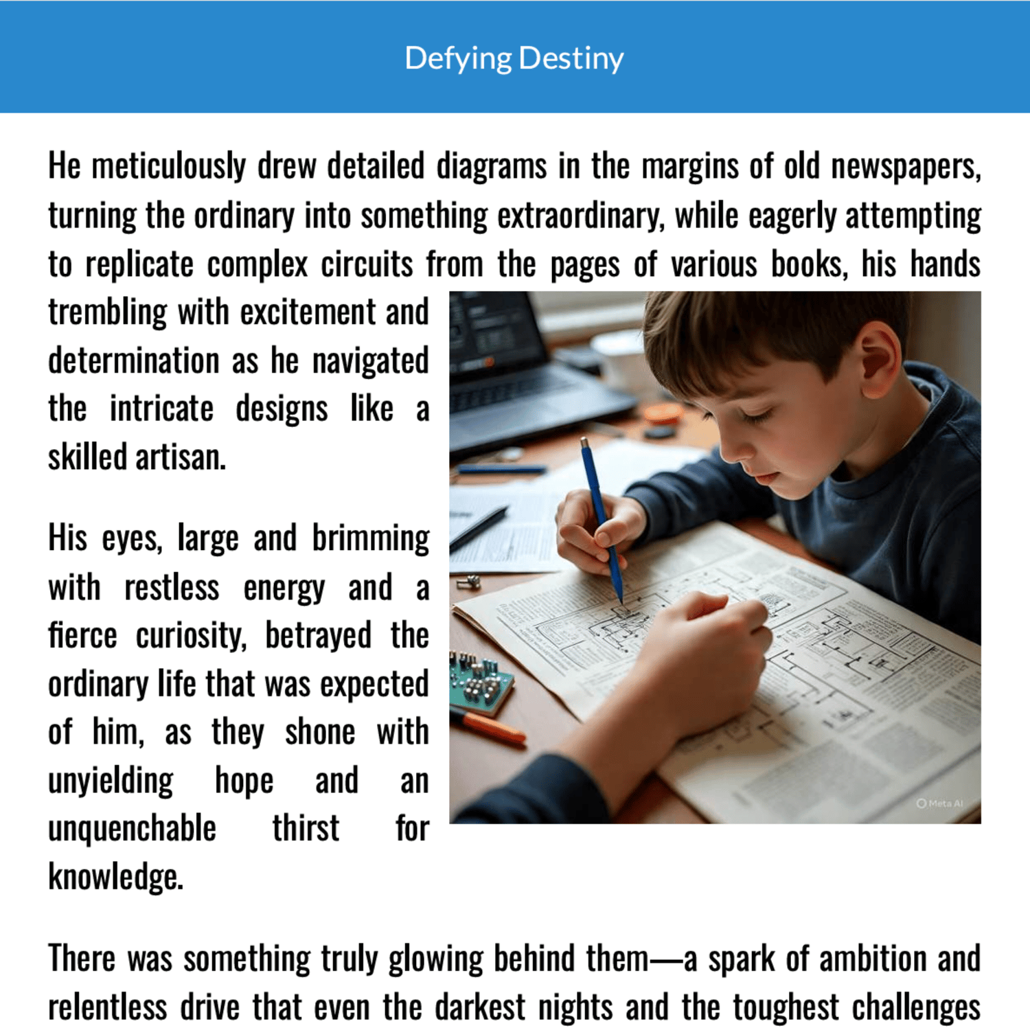 At night, when others gave in to despair, he gazed at the planes above, imagining worlds beyond the crumbling alleys. Worlds he believed he could reach. Worlds he believed he could change.
